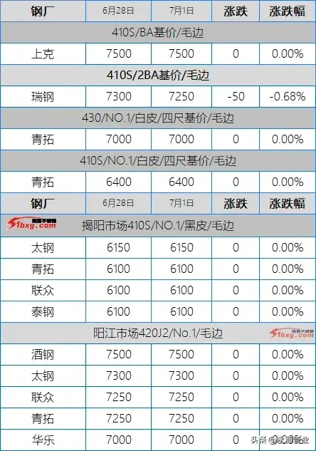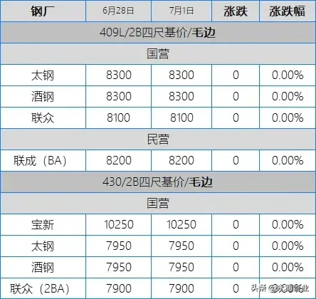 目前市場主流報價:410S熱軋黑皮在6100-6150元/噸;430熱軋黑皮在6700-6800元/噸;太鋼/酒鋼430/2B(毛)在7950-8000元/噸;聯眾430/2BA(毛)在7850元/噸左右;宏旺430/2BA(毛)在7750-7800元/噸;甬金430/BA(毛)在8350元/噸左右;上克430/BA(毛)在8350元/噸左右;宏旺430/BA(毛)在8150-8200元/噸;瑞鋼430/2BA(毛)在7700-7750元/噸,其中期貨價在7800元/噸左右;聯成430/BA(毛)在8200元/噸左右。