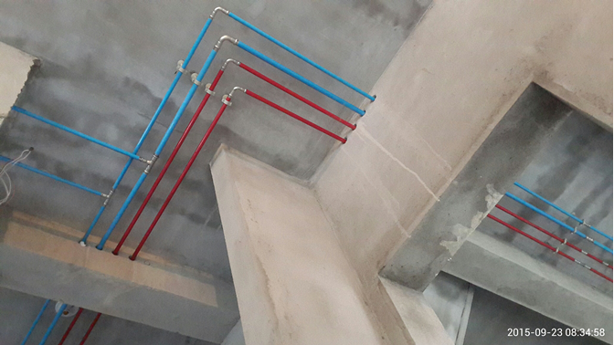 驗(yàn)收技巧:禁止把水管壓在管線上面,首先要分清水管和管線。支架入墻處標(biāo)有紅線的水管是熱水管,標(biāo)有藍(lán)線的水管是冷水管,較細(xì)的純白色管是管線。